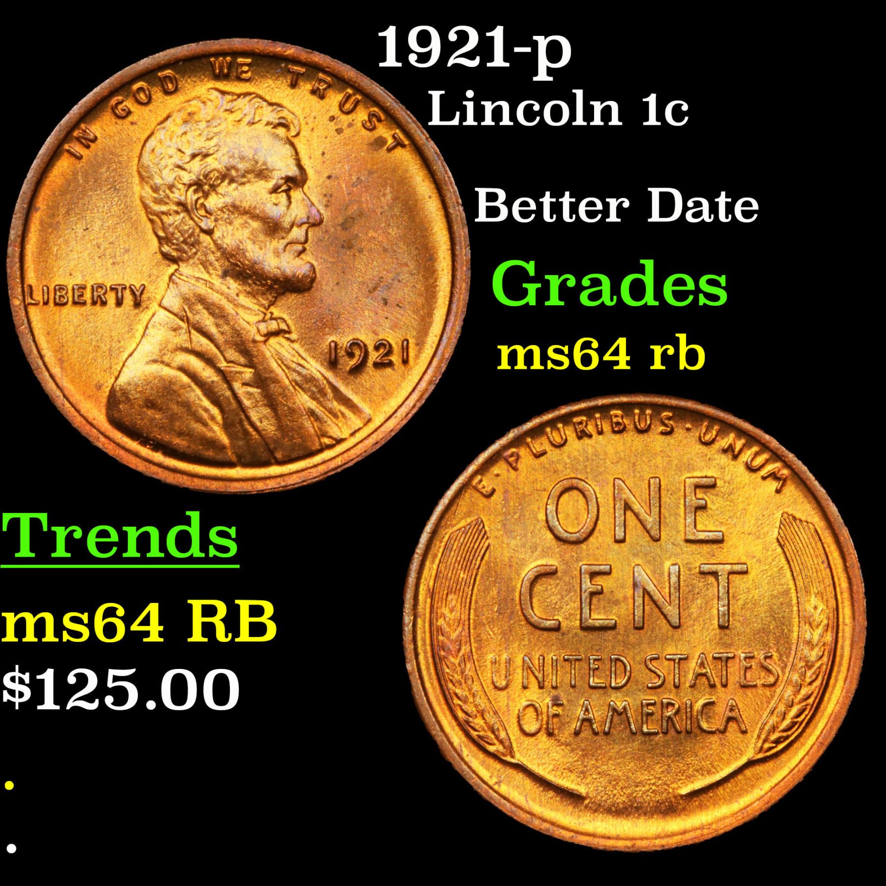 1921-p Lincoln Cent 1c Grades Choice Unc RB.