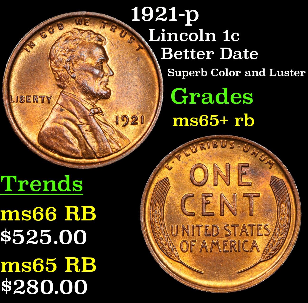 1921-p Better Date Superb Color and Luster Lincoln Cent 1c Grades Gem+ Unc RB.