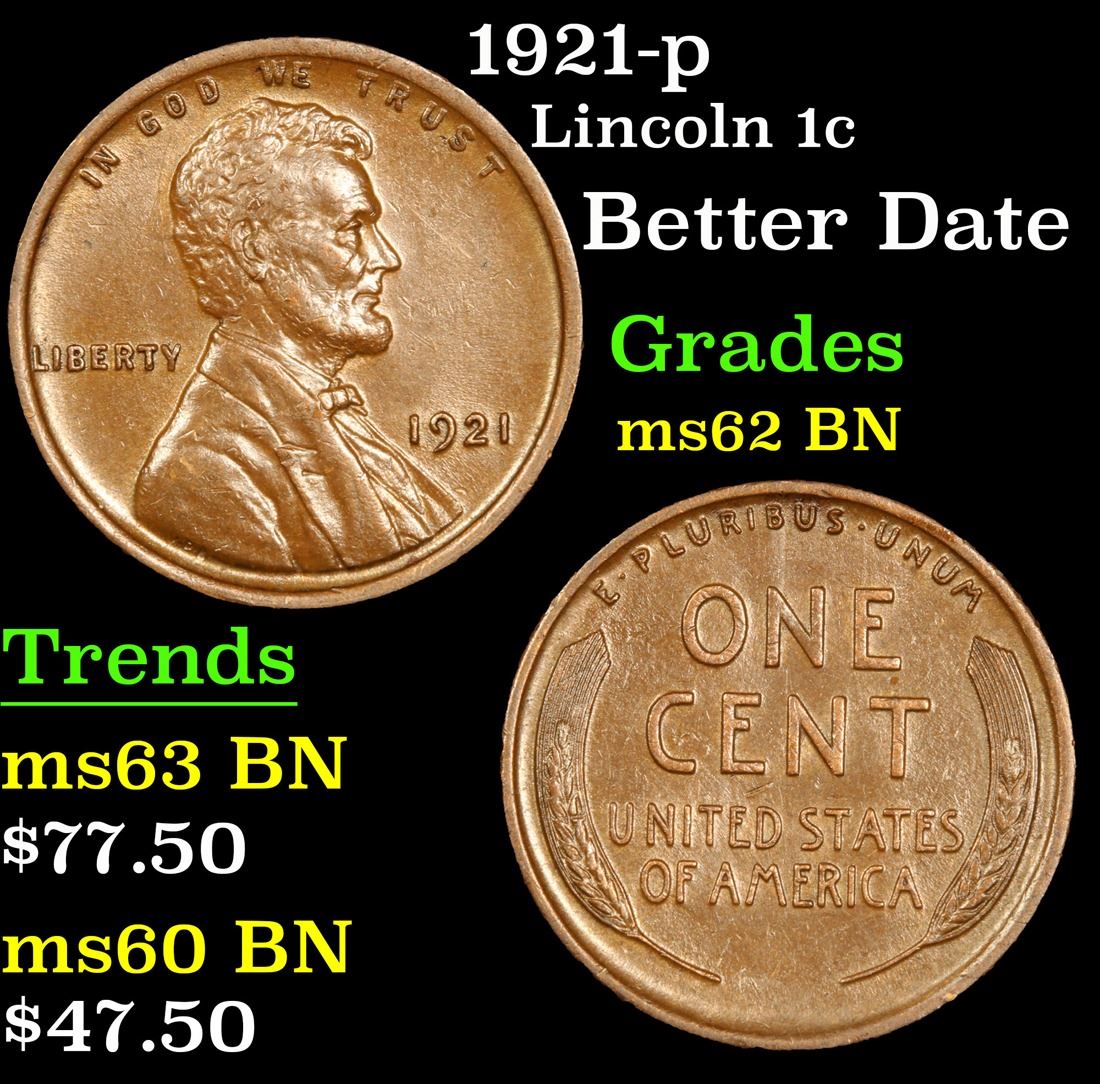 1921-p Better Date . Lincoln Cent 1c Grades Select Unc BN. With an original mintage of over 39 million pieces, PCGS estimates that only 1000 survive in ms65 or better.