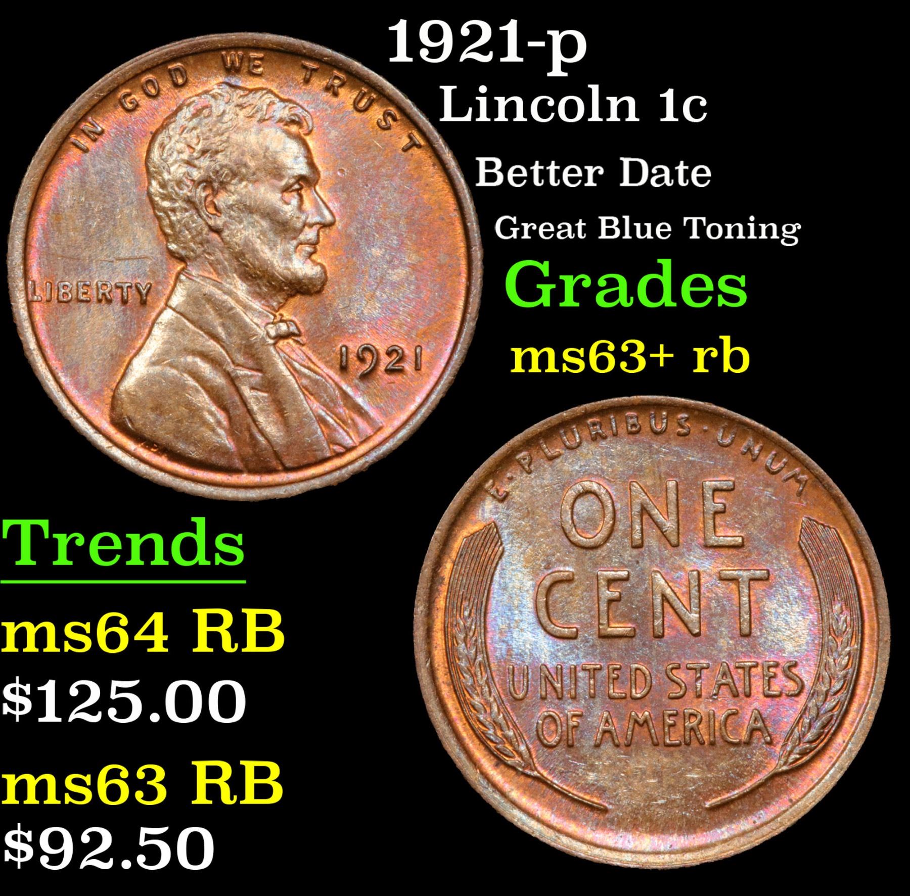 1921-p Better Date Great Blue Toning Lincoln Cent 1c Grades Select+ Unc RB. With an original mintage of over 39 million pieces, PCGS estimates that only 1000 survive in ms65 or better.