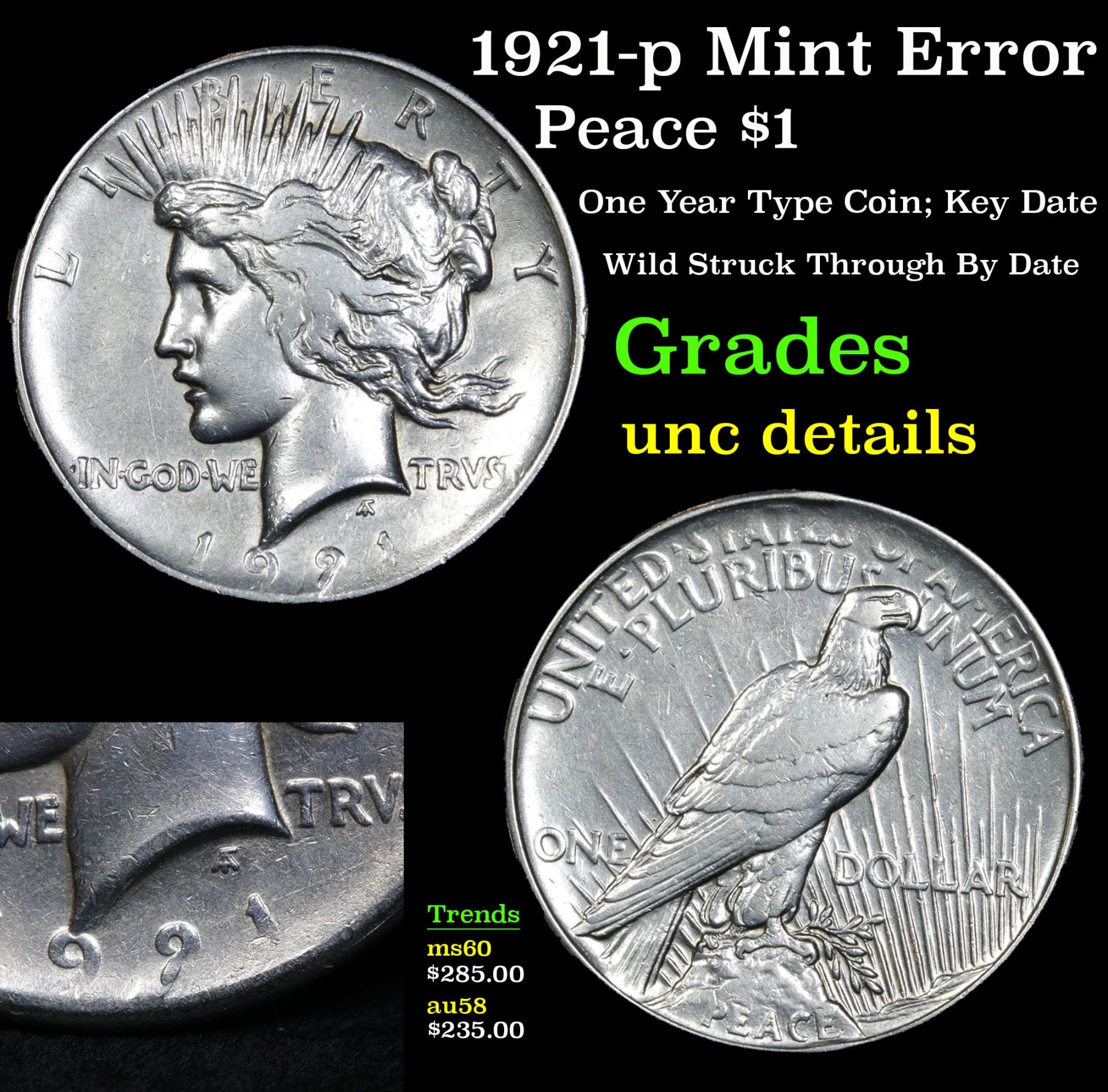1921-p Mint Error Peace Dollar $1 Grades Unc Details. One Year Type Coin; Key Date Wild Struck Through By Date