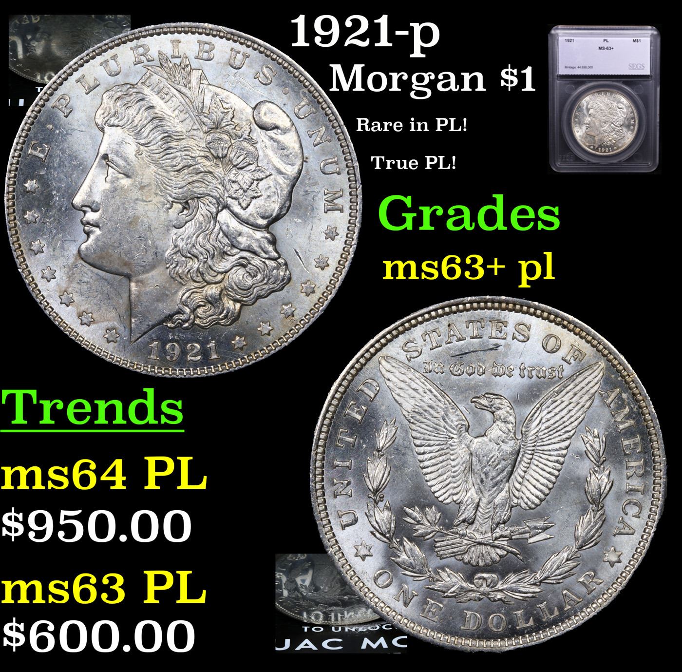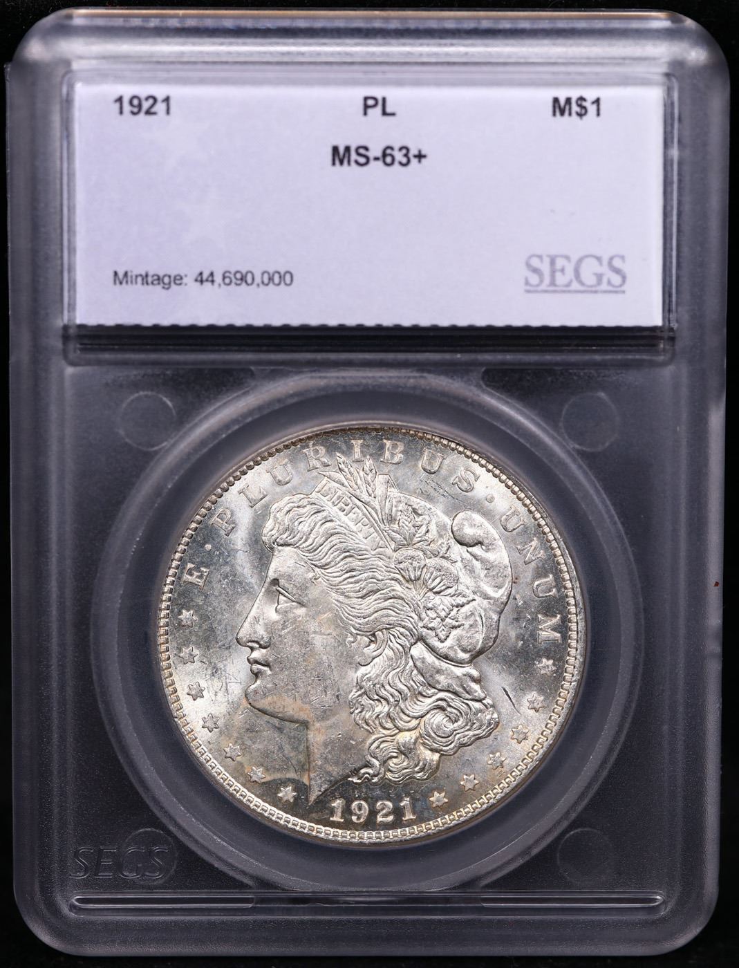 1921-p Morgan Dollar $1 Graded ms63+ pl By SEGS. A Key Date's Pick, Bid to Win, Don't let it get Away, you might not find its equal Coin