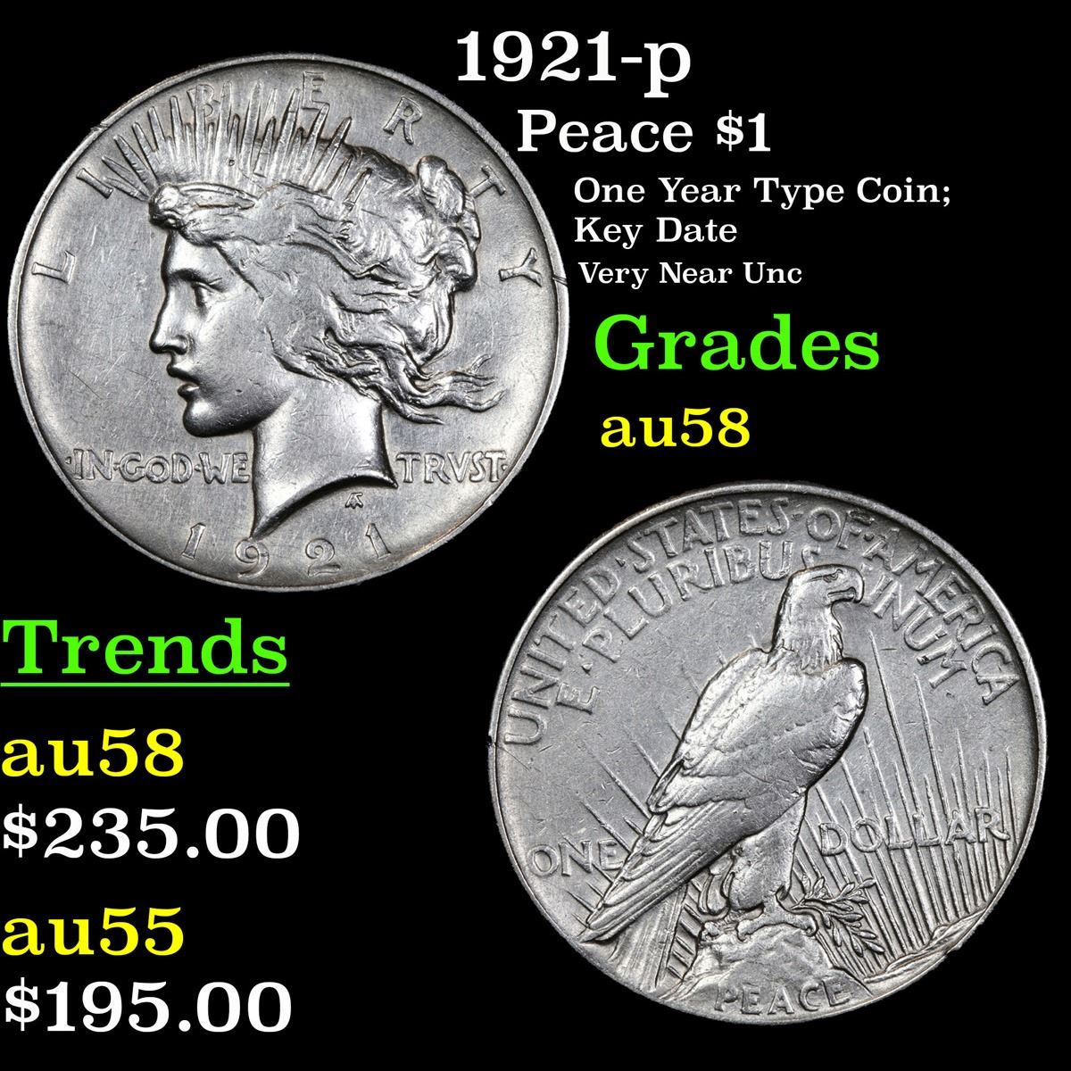 1921-p One Year Type Coin; Key Date Very Near Unc Peace Dollar $1 Grades Choice AU/BU Slider.