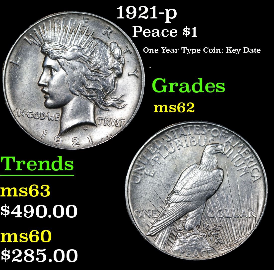 1921-p One Year Type Coin; Key Date . Peace Dollar $1 Grades Select Unc.