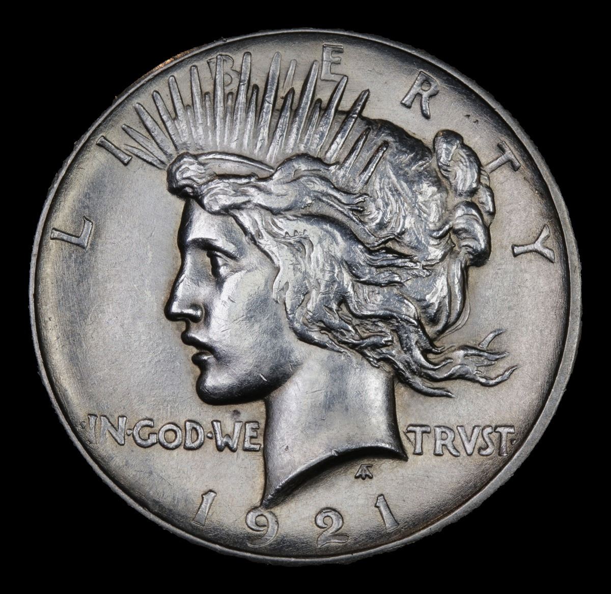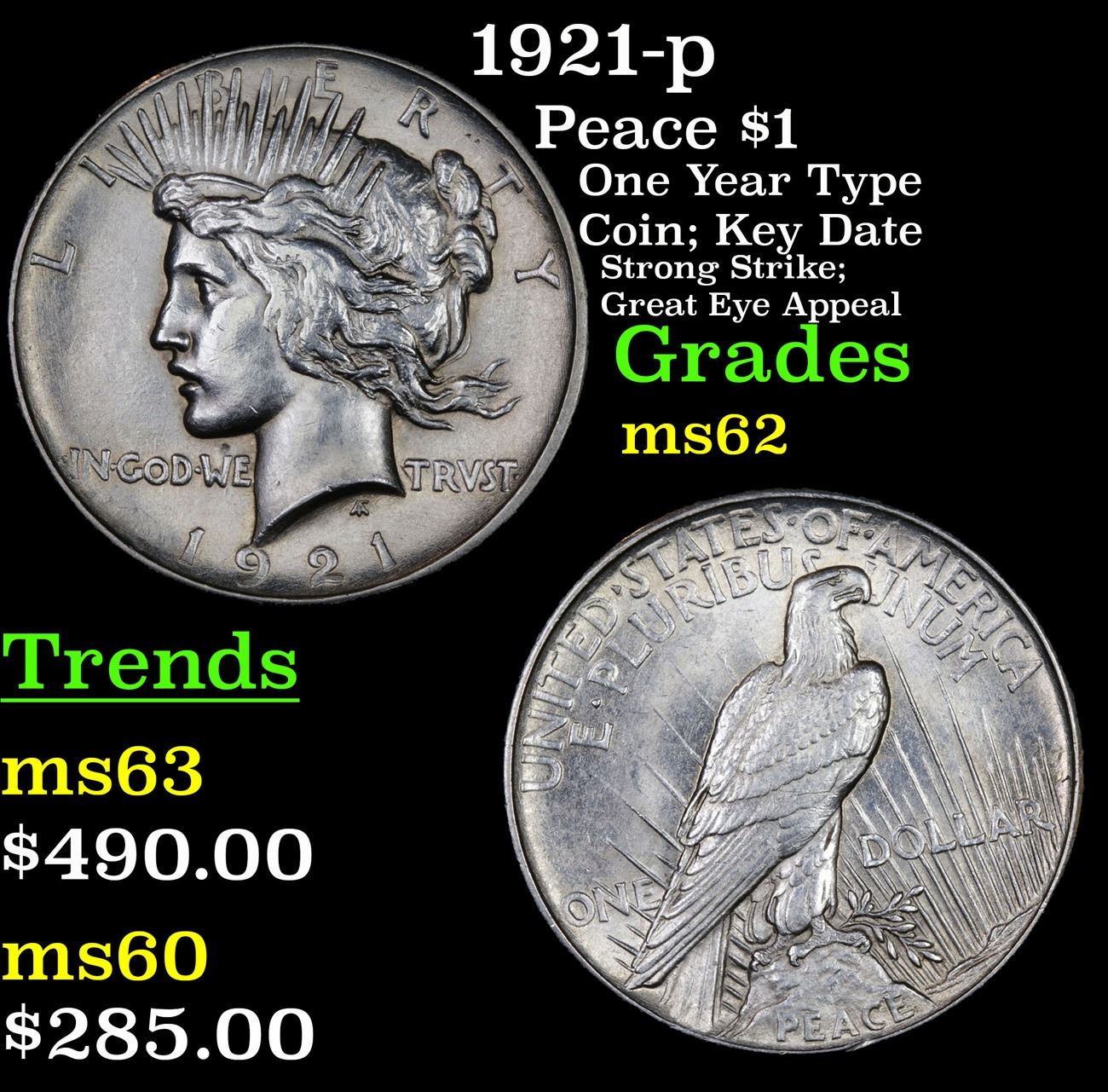 1921-p One Year Type Coin; Key Date Strong Strike; Great Eye Appeal Peace Dollar $1 Grades Select Unc. Superior detail in the Hair, Superior wing feathers. If the Mint could have consistently produced a 1921-p like the example up for auction, they would have made the whole series in High Relief! Wow, what a superb example of a coin that never comes as a superb example