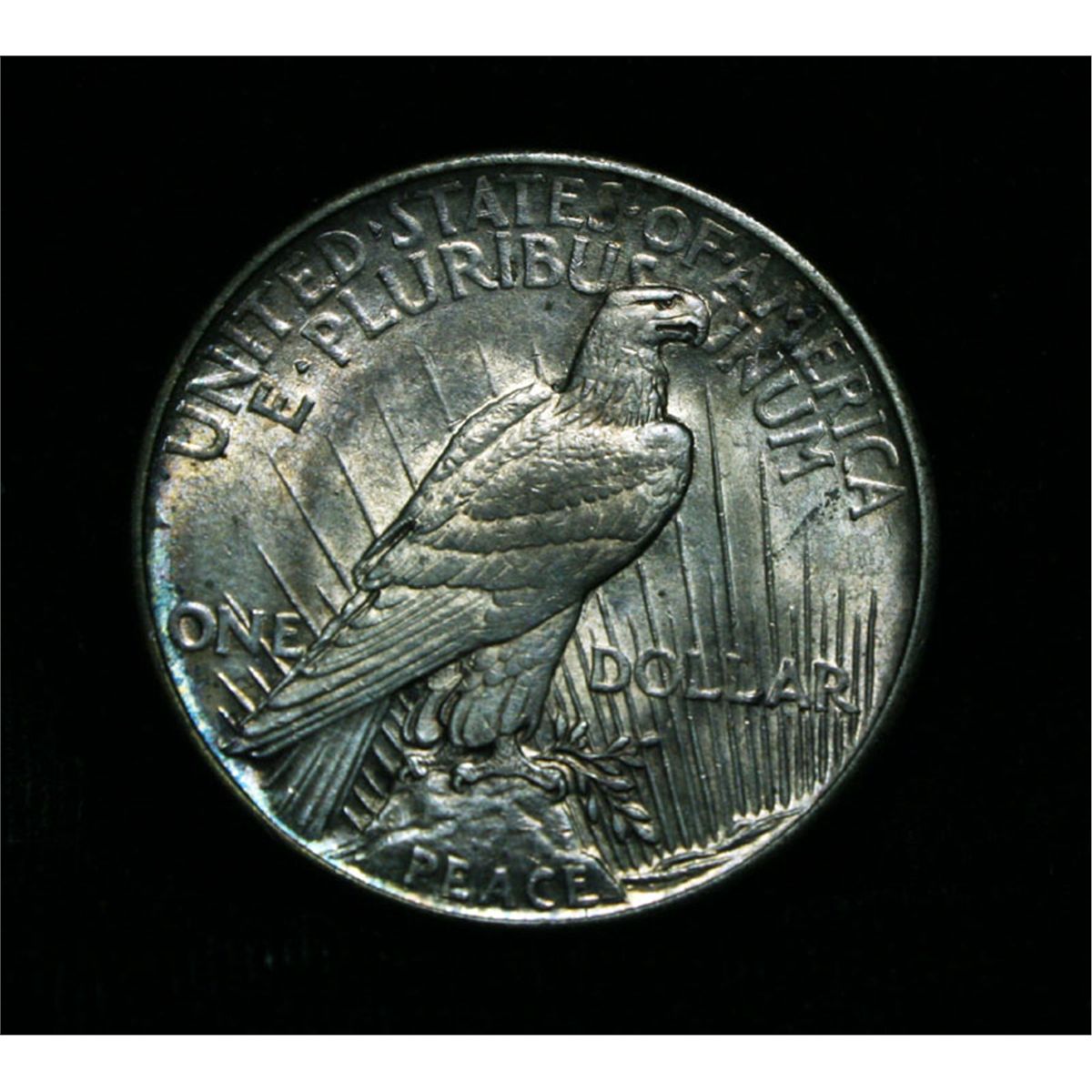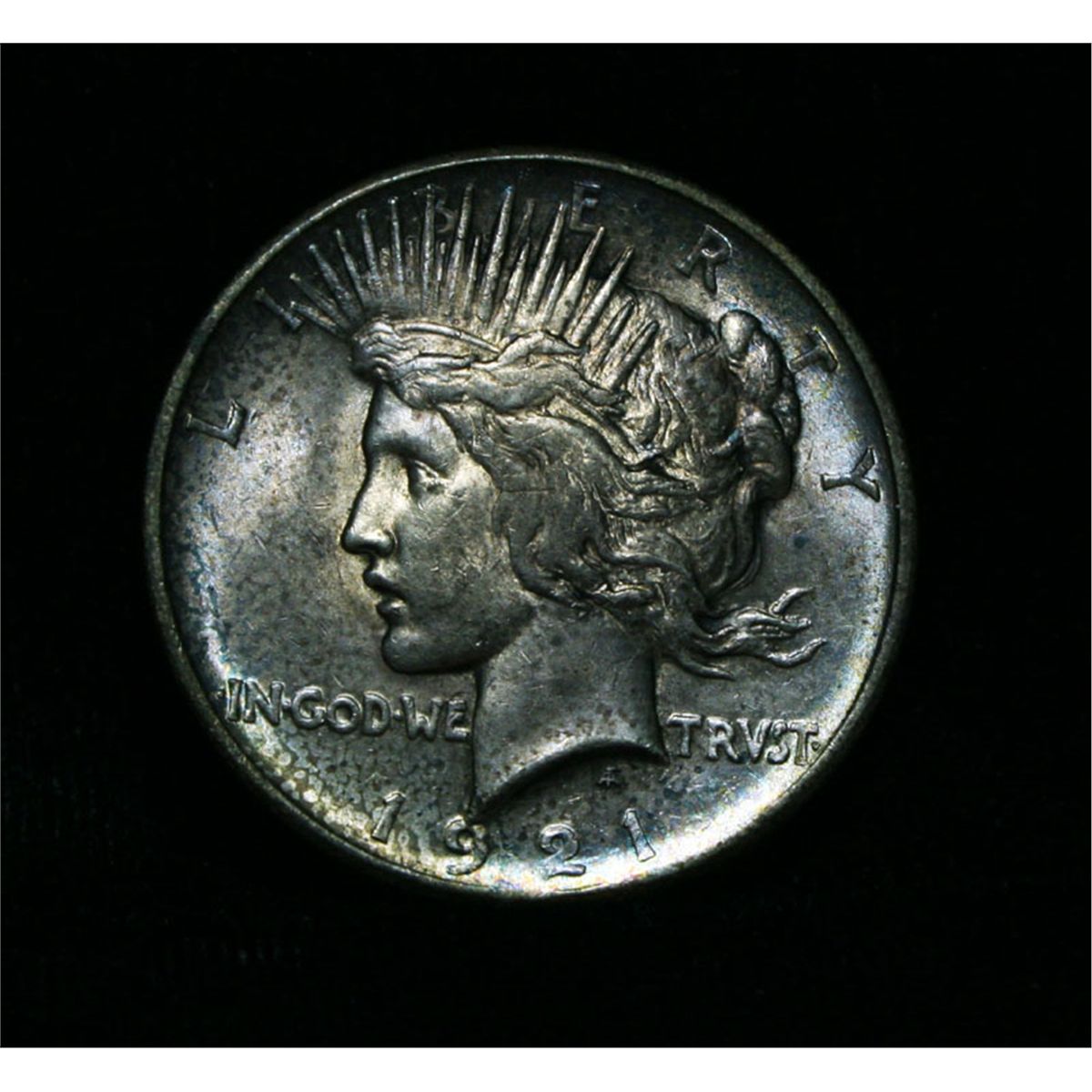 Nicely Toned 1921 Peace Dollar. The coin is deeply toned with purples and golds on the obverse and gold, bronze and green on the reverse. One year type coin, always in demand as you need it to complete a type set. The High Relief design was discontinued after 1921 due to an inability to consistently Create a fully struck coin. NGC's Price Guide lists ms63 at $400 and The Wholesale Greysheet lists ms63 at $320. Estimated Value $375