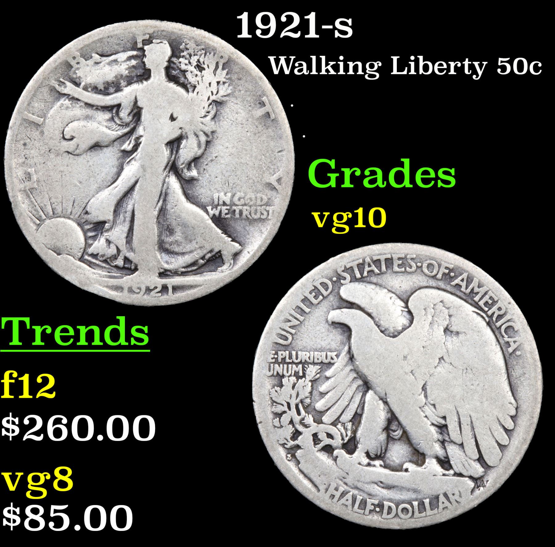 1921-s Walking Liberty Half Dollar 50c Grades vg+.