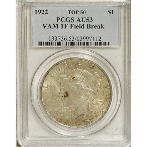 <B>1922 $1 AU53 PCGS.</B></I> VAM-1F. A Top 50 Variety. This is the so-called Field Break variety, which shows a prominent die break in the reverse field just before the eagle's breast. This variety is one of 10 or 12 significant die breaks known for the 1922 issue, the undoubted result of the enormous mintage of more than 51 million silver dollars in this year. This piece offers silver-gold surfaces that are still somewhat lustrous, with a few dark copper-colored spots scattered about.<BR><BR><b>Shipping:</b> Coins & Currency (<a target="_blank" href="http://www.heritageauctions.com/common/shipping.php">view shipping information</a>)
