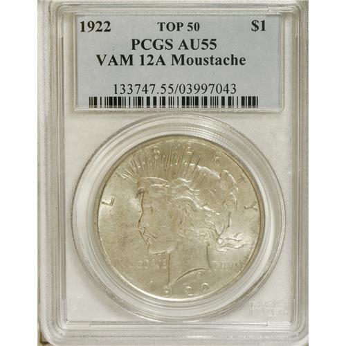 <B>1922 $1 AU55 PCGS.</B></I> VAM-12A. A Top 50 Variety. The popular Moustache obverse is combined with a doubled die reverse on the VAM-12A. Originally designated as VAM-2B, the variant is now known as the VAM-12A after the discovery that the doubled die reverse is actually a late die state of the VAM-12. The obverse, besides the prominent "moustache" die break, shows a small die crack through GOD. On the reverse many of the rays above and below the eagle's leg feathers, as well as other details, show doubling. This example shows light wear and a silver-gold cast.<BR><BR><b>Shipping:</b> Coins & Currency (<a target="_blank" href="http://www.heritageauctions.com/common/shipping.php">view shipping information</a>)