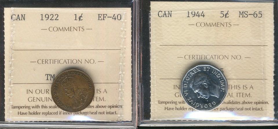 1922 1¢ EF40 & 1944 5¢ MS65. Lot of 2 coins both ICCS graded.