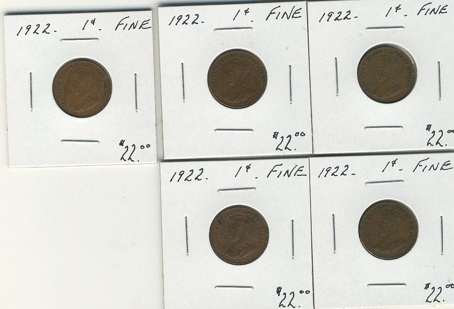 1922 1¢ Fine. Lot of 5 coins. (PBA).
