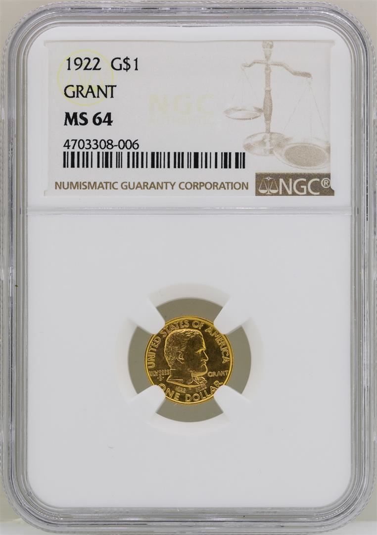 One 1922 $1 Grant Commemorative Gold Dollar Coin NGC MS64. NGC Certified.