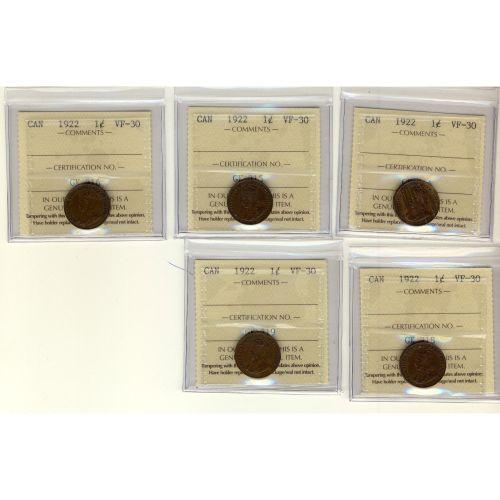 1922 1¢ ICCS VF-30, lot of 5 pcs.