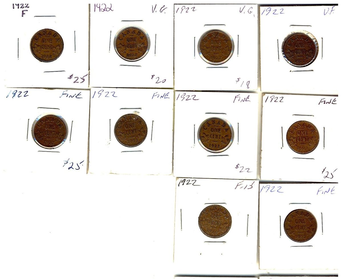 1922 1¢. Lot of 10 key date cents. VG to F.