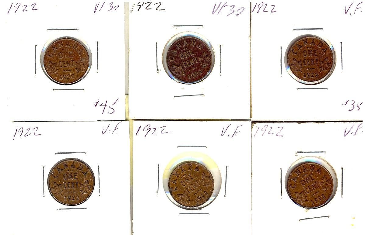 1922 1¢. Lot of 6 key date cents. F to VF.
