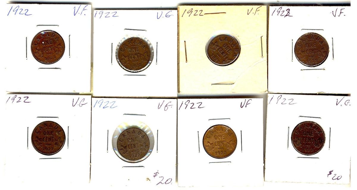 1922 1¢. Lot of 8 key date cents. G+ to Fine.