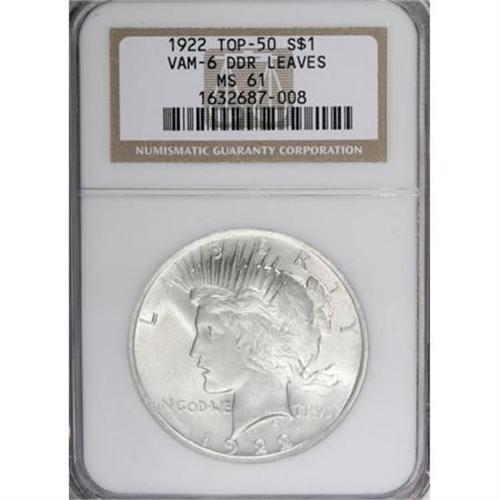 <B>1922 $1 Double Die Reverse "Leaves" MS61 NGC.</B></I> VAM-6. A Top 50 Variety. NGC Census: (251/95634). PCGS Population (289/57869). Mintage: 51,737,000. Numismedia Wsl. Price for NGC/PCGS coin in MS61: $18. (#7357)<BR><BR><B>Coin Engraver:</B> Anthony de Francisci<BR><BR><b>Shipping:</b> Coins & Currency (<a target="_blank" href="http://www.heritageauctions.com/common/shipping.php">view shipping information</a>)