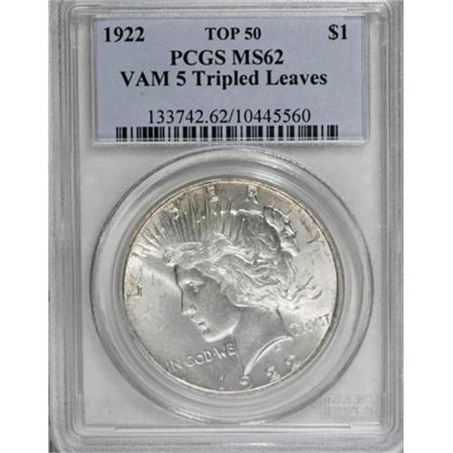 <B>1922 $1 MS62 PCGS.</B></I> Vam-5 ,Tripled Leaves ,Top 50. PCGS Population (5/5). NGC Census: (0/0). (#133742)<BR><BR><b>Shipping:</b> Coins & Currency (<a target="_blank" href="http://www.heritageauctions.com/common/shipping.php">view shipping information</a>)