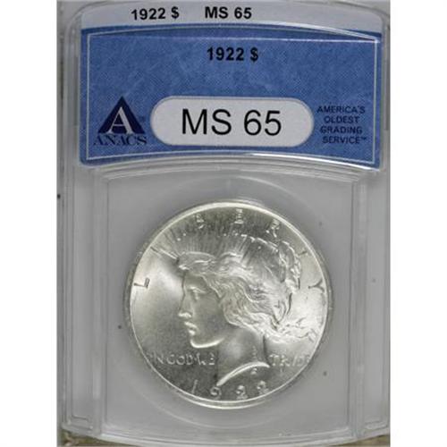 <B>1922 $1 MS65 ANACS.</B></I> NGC Census: (9241/651). PCGS Population (4538/453). Mintage: 51,737,000. Numismedia Wsl. Price for NGC/PCGS coin in MS65: $130. (#7357)<BR><BR><B>Coin Engraver:</B> Anthony de Francisci<BR><BR><b>Shipping:</b> Coins & Currency (<a target="_blank" href="http://www.heritageauctions.com/common/shipping.php">view shipping information</a>)