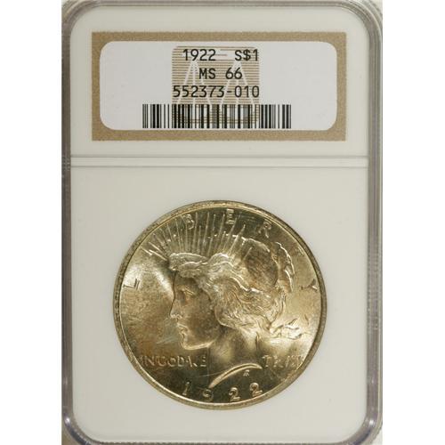 <B>1922 $1 MS66 NGC.</B></I> NGC Census: (595/10). PCGS Population (413/20). Mintage: 51,737,000. Numismedia Wsl. Price for NGC/PCGS coin in MS66: $580. (#7357)<BR><BR><b>Shipping:</b> Coins & Currency (<a target="_blank" href="http://www.heritageauctions.com/common/shipping.php">view shipping information</a>)