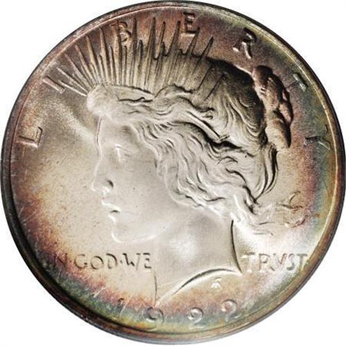 <B>1922 $1 MS66 PCGS.</B></I> Both sides are gorgeously toned. The obverse has powder-blue, lemon, and rose-red bands that encompass the light golden-brown center. The reverse is even more colorful, adorned with apple-green, violet-red, and honey shades. Highly lustrous and well struck with smooth fields.<BR><BR><B>Coin Engraver:</B> Anthony de Francisci<BR><BR><b>Shipping:</b> Coins & Currency (<a target="_blank" href="http://www.heritageauctions.com/common/shipping.php">view shipping information</a>)
