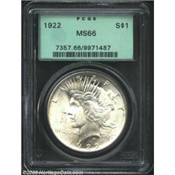 <TR><TD width="100%"><TABLE cellSpacing=1 cellPadding=3 width="100%" border=0><TBODY><TR><TD width="100%" bgColor=#79735c><FONT face=arial color=#ffffff size=3><B>Description</B> </FONT></TD></TR><TR><TD width="100%" bgColor=#ffffff><FONT face=arial size=2><B>1922 $1 MS66 PCGS.</B></I> A satiny, lustrous Gem, of premium quality. A few small contact marks reside near the center of either side, and small patches of beige patina are seen here and there. A slender die crack, as struck, extends along the base of Liberty's portrait. </FONT></TD></TR></TBODY></TABLE></TD></TR></TBODY></TABLE><BR><A name=PricesRealized></A><TABLE cellSpacing=0 cellPadding=0 width="100%" bgColor=#000000 border=0><TBODY><TR><TD width="100%"><TABLE cellSpacing=1 cellPadding=3 width="100%" border=0><TBODY><TR><TD width="100%" bgColor=#79735c><A name=PR><FONT face=arial color=#ffffff size=3><B>Previous Prices from Heritage Auctions</B> </FONT></A></TD></TR><TR><TD bgColor=#f6f6ed><TABLE cellSpacing=0 cellPadding=0 width="100%" border=1><TBODY><TR><TD align=middle width="33%"><B>Date</B></TD><TD align=middle width="33%"><B>Service</B></TD><TD align=middle width="33%"><B>Price</B></TD></TR><TR bgColor=whitesmoke><TD width="33%"><B>01/11/2003</B></TD><TD width="33%">PCGS</TD><TD width="33%">$747.50</TD></TR><TR bgColor=whitesmoke><TD width="33%"><B>09/28/2002</B></TD><TD width="33%">PCGS</TD><TD width="33%">$862.50</TD></TR><TR bgColor=whitesmoke><TD width="33%"><B>04/28/2002</B></TD><TD width="33%">PCGS</TD><TD width="33%">$460.00</TD></TR><TR bgColor=whitesmoke><TD width="33%"><B>11/15/2001</B></TD><TD width="33%">PCGS</TD><TD width="33%">$425.50</TD></TR><TR bgColor=whitesmoke><TD width="33%"><B>06/06/1997</B></TD><TD width="33%">PCGS</TD><TD width="33%">$1,322.50</TD></TR><TR bgColor=whitesmoke><TD width="33%"><B>05/05/2000</B></TD><TD width="33%">PCGS</TD><TD width="33%">$575.00</TD></TR><TR bgColor=whitesmoke><TD width="33%"><B>11/01/1999</B></TD><TD width="33%">PCGS</TD><TD width="33%">$990.00</TD></TR><TR bgColor=whitesmoke><TD width="33%"><B>09/01/1995</B></TD><TD width="33%">PCGS</TD><TD width="33%">$605.00</TD></TR><TR bgColor=whitesmoke><TD width="33%"><B>03/01/2000</B></TD><TD width="33%">PCGS</TD><TD width="33%">$518.00</TD></TR><TR bgColor=whitesmoke><TD width="33%"><B>03/03/2003</B></TD><TD width="33%">NGC</TD><TD width="33%">$402.50</TD></TR><TR bgColor=whitesmoke><TD width="33%"><B>09/28/2002</B></TD><TD width="33%">NGC</TD><TD width="33%">$488.75</TD></TR><TR bgColor=whitesmoke><TD width="33%"><B>04/02/2002</B></TD><TD width="33%">NGC</TD><TD width="33%">$437.00</TD></TR><TR bgColor=whitesmoke><TD width="33%"><B>02/11/2000</B></TD><TD width="33%">NGC</TD><TD width="33%">$471.50</TD></TR><TR bgColor=whitesmoke><TD width="33%"><B>05/05/2000</B></TD><TD width="33%">NGC</TD><TD width="33%">$368.00</TD></TR><TR bgColor=whitesmoke><TD width="33%"><B>10/31/2000</B></TD><TD width="33%">NGC</TD><TD width="33%">$400.00</TD></TR><TR bgColor=whitesmoke><TD width="33%"><B>05/29/2001</B></TD><TD width="33%">NGC</TD><TD width="33%">$360.00</TD></TR><TR bgColor=whitesmoke><TD width="33%"><B>11/12/1993</B></TD><TD width="33%">ANACS</TD><TD width="33%">$550.00</TD></TR></TBODY></TABLE></TD></TR><TR><TD bgColor=#ffffff><FONT face=arial size=1 ?>PLEASE NOTE: All prices realized reflect the final hammer price PLUS the buyer's premium in auctions that charge a buyer's premium. Each item has a notation at the top of the listing indicating whether that lot included a buyer's premium. Example: A item that sells with a final hammer price of $100 and a 20% buyer's premium will display with a price realized of $120. All information listed is intended to be as accurate as possible, but errors are possible. Please use this guide carefully and inform us of any inaccuracies. </FONT></TD></TR></TBODY></TABLE></TD></TR></TBODY></TABLE><BR><TABLE cellSpacing=0 cellPadding=0 width="100%" bgColor=#000000 border=0><TBODY><TR><TD width="100%"><TABLE cellSpacing=1 cellPadding=3 width="100%" border=0><TBODY><TR><TD width="100%" bgColor=#79735c colSpan=6><FONT face=arial color=#ffffff size=3><B>Price Guide*</B> </FONT></TD></TR><TR bgColor=#f6f6ed><TD align=middle><B>Grade</B> </TD><TD align=middle><B>Coin World<BR>(Trends)</B> </TD><TD align=middle><B>Numismedia<BR>Retail</B> </TD><TD align=middle><B>Numismedia<BR>Wholesale</B> </TD><TD align=middle><B>Coin<BR>Universe</B> </TD><TD align=middle><B>Heritage<BR>Value Index</B> </TD></TR><TR bgColor=#ffffff><TD align=middle>65</TD><TD align=right>$110.00</TD><TD align=right>$92.00</TD><TD align=right>$77.00</TD><TD align=right>$95.00</TD><TD align=right>$75.75</TD></TR><TR style="FONT-WEIGHT: bold" bgColor=#cccfdd><TD align=middle>66</TD><TD align=right>$650.00</TD><TD align=right>$594.00</TD><TD align=right>$475.00</TD><TD align=right>$650.00</TD><TD align=right>$435.00</TD></TR><TR bgColor=#ffffff><TD align=middle>67</TD><TD align=right>---</TD><TD align=right>---</TD><TD align=right>$6,250.00</TD><TD align=right>$9,500.00</TD><TD align=right>$7,039.00</TD></TR><TR bgColor=#ffffff><TD colSpan=6><FONT size=1>*All information listed is intended to be as accurate as possible, but errors are possible. No item may be returned or refused based on this information which is provided as a service to our customers. You should contact each pricing source directly to determine the accuracy of this information. </FONT></TD></TR></TBODY></TABLE></TD></TR></TBODY></TABLE><BR><TABLE cellSpacing=0 cellPadding=0 width="100%" bgColor=#000000 border=0><TBODY><TR><TD width="100%"><TABLE cellSpacing=1 cellPadding=3 width="100%" border=0><TBODY><TR><TD width="100%" bgColor=#79735c><FONT face=arial color=#ffffff size=3><B>Population Guide</B> </FONT></TD></TR><TR bgColor=#ffffff><TD align=middle><!-- Begin Output of Population Grid--><TABLE cellSpacing=0 cellPadding=0 width="100%" border=0><TBODY><TR><TD vAlign=center><TABLE cellSpacing=0 width="100%" border=1 cellsadding="3"><TBODY><TR><TD vAlign=center><TABLE cell