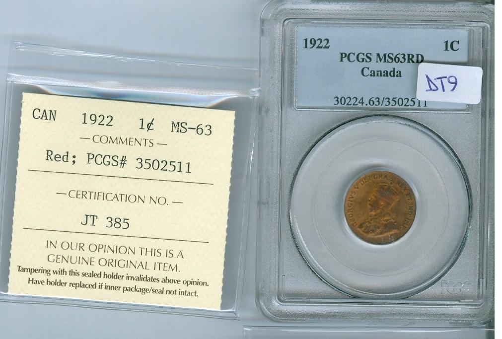 1922 1¢ PCGS MS63RD. Key date issue, wine red.