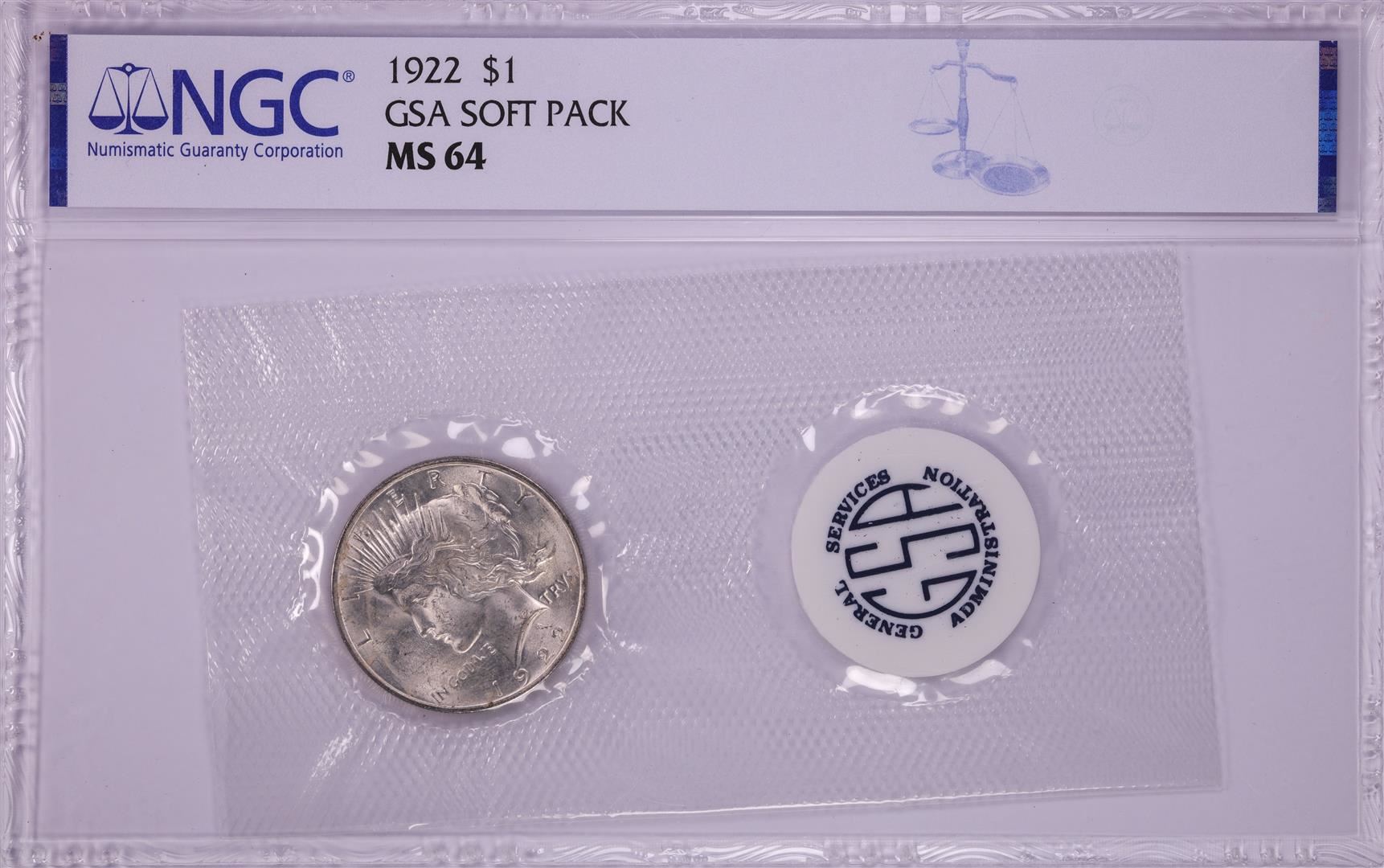 One 1922 $1 Peace Silver Dollar Coin GSA Soft Pack NGC MS64. NGC Certified.