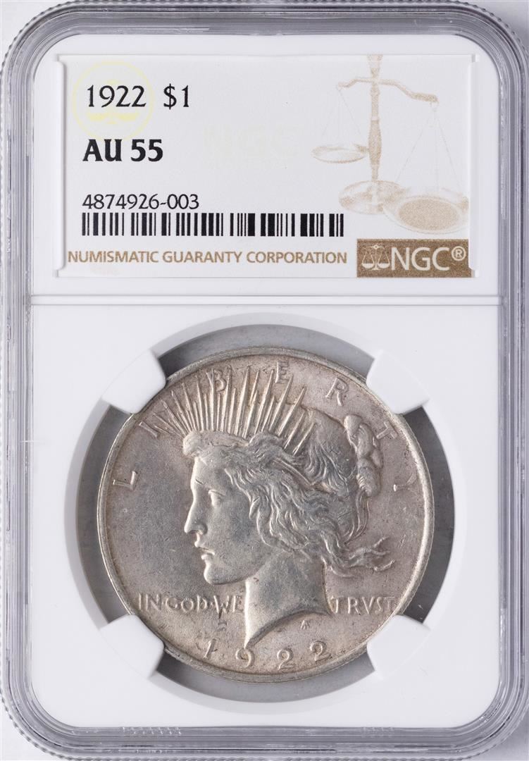 One 1922 $1 Peace Silver Dollar Coin NGC AU55. NGC Certified.