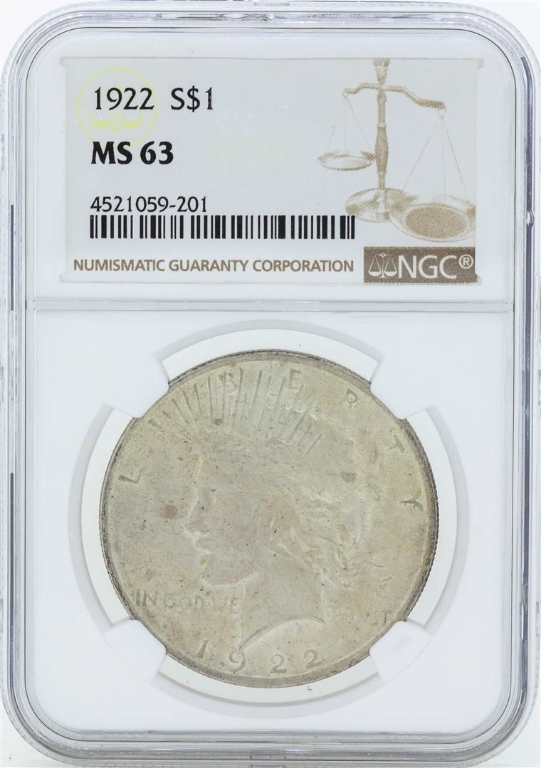 One 1922 $1 Peace Silver Dollar Coin NGC MS63. NGC Certified.