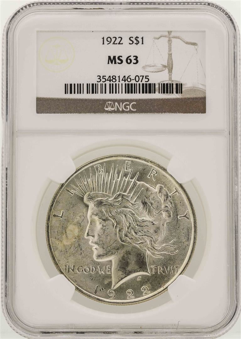 One 1922 $1 Peace Silver Dollar Coin NGC MS63. NGC Certified.
