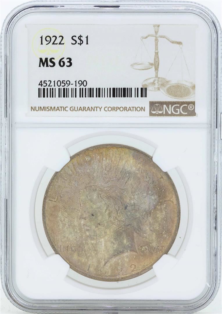 One 1922 $1 Peace Silver Dollar Coin NGC MS63. NGC Certified.