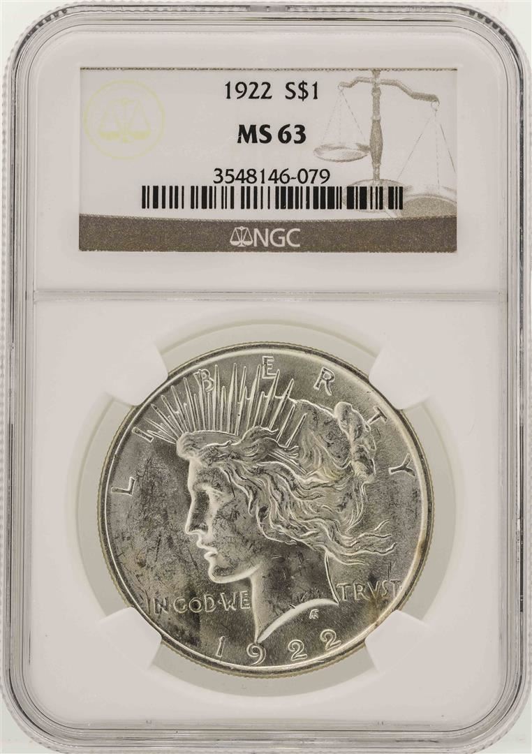 One 1922 $1 Peace Silver Dollar Coin NGC MS63. NGC Certified.