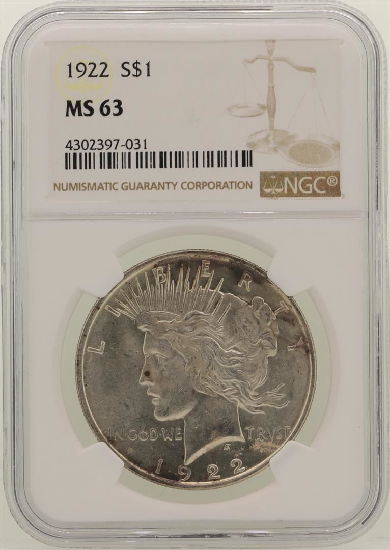 One 1922 $1 Peace Silver Dollar Coin NGC MS63. NGC Certified.