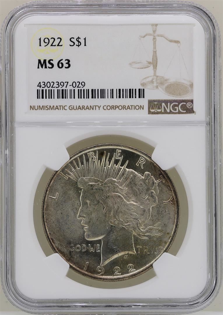 One 1922 $1 Peace Silver Dollar Coin NGC MS63. NGC Certified.