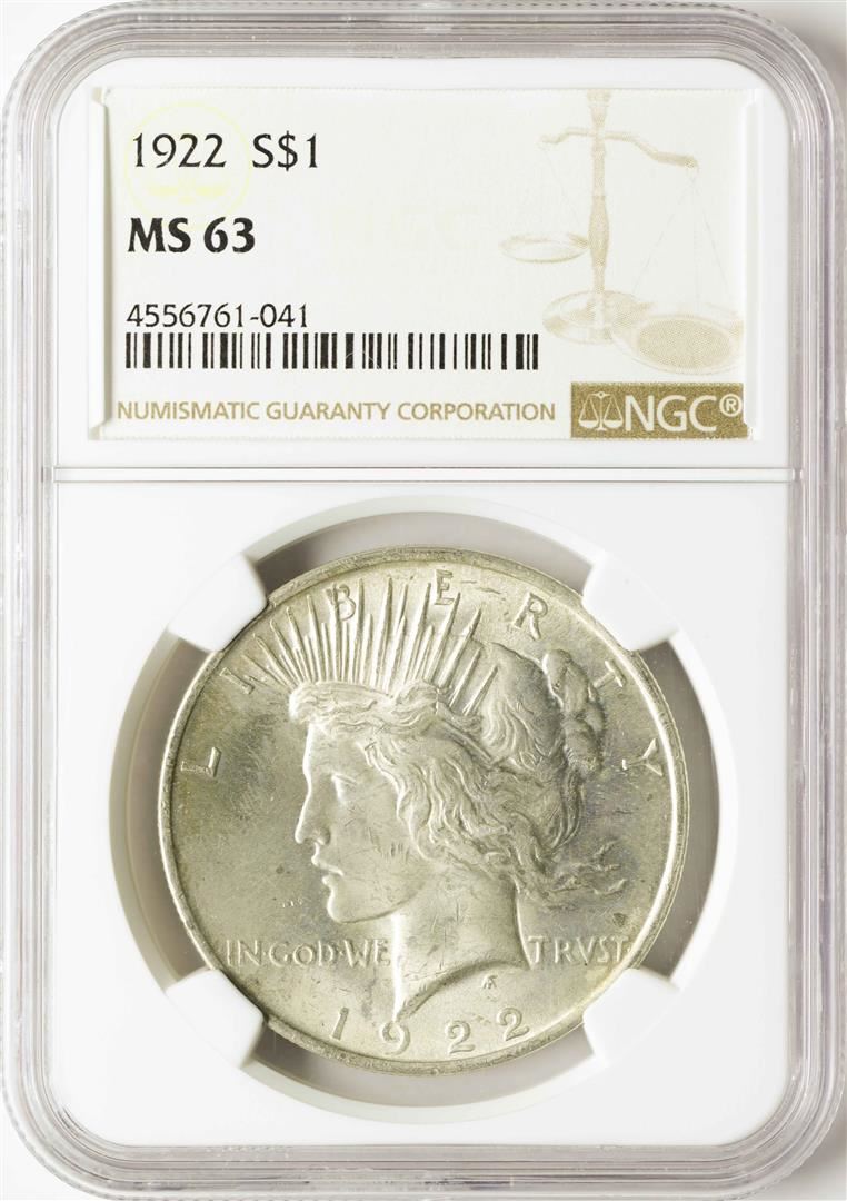 One 1922 $1 Peace Silver Dollar Coin NGC MS63. NGC Certified.