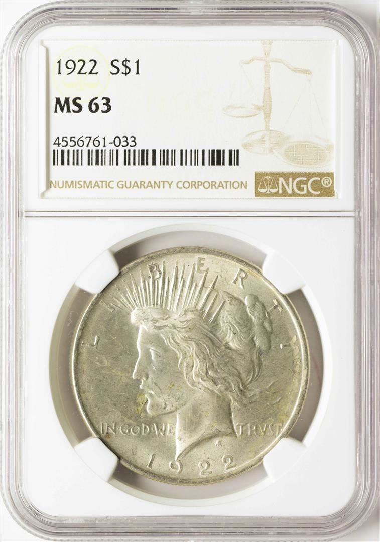 One 1922 $1 Peace Silver Dollar Coin NGC MS63. NGC Certified.
