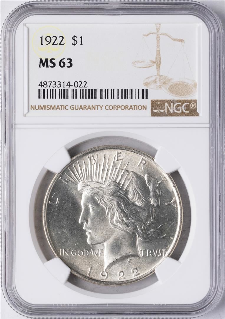 One 1922 $1 Peace Silver Dollar Coin NGC MS63. NGC Certified.