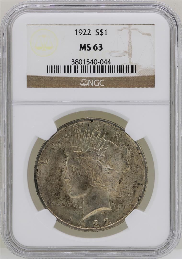 One 1922 $1 Peace Silver Dollar Coin NGC MS63. NGC Certified.