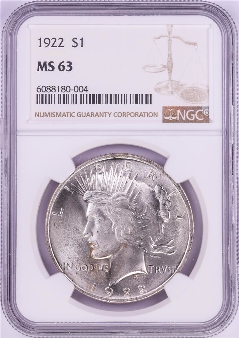 One 1922 $1 Peace Silver Dollar Coin NGC MS63. NGC Certified.