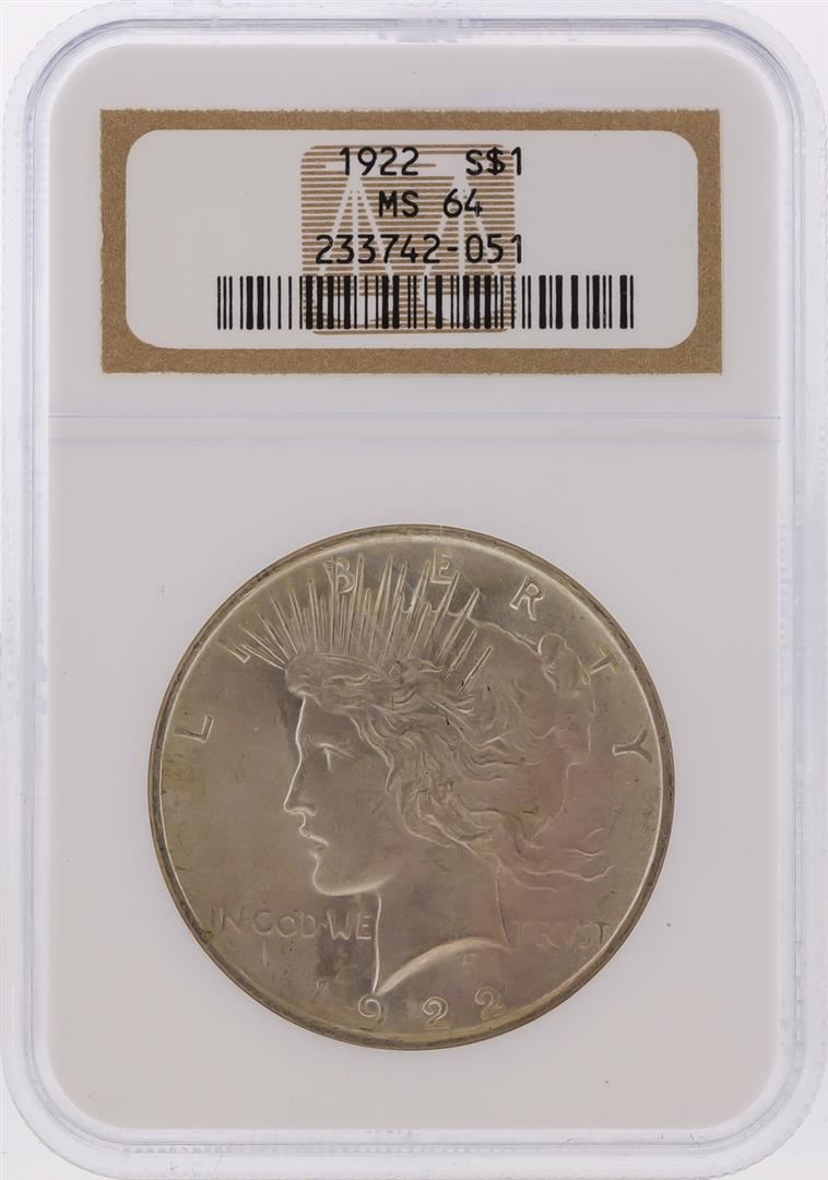 One 1922 $1 Peace Silver Dollar Coin NGC MS64. NGC Certified.