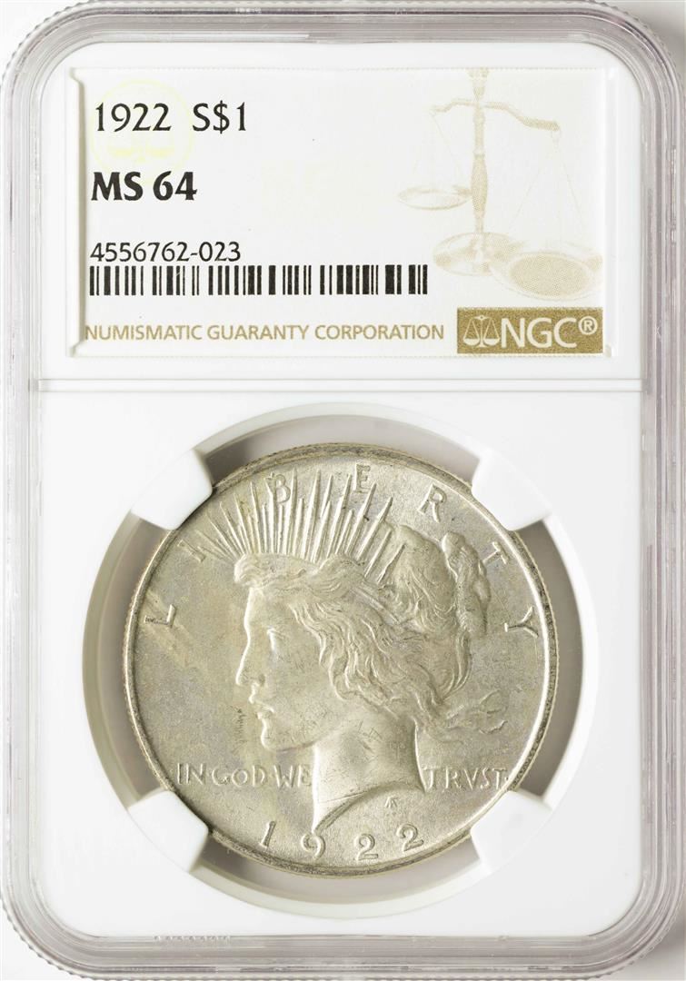 One 1922 $1 Peace Silver Dollar Coin NGC MS64. NGC Certified.