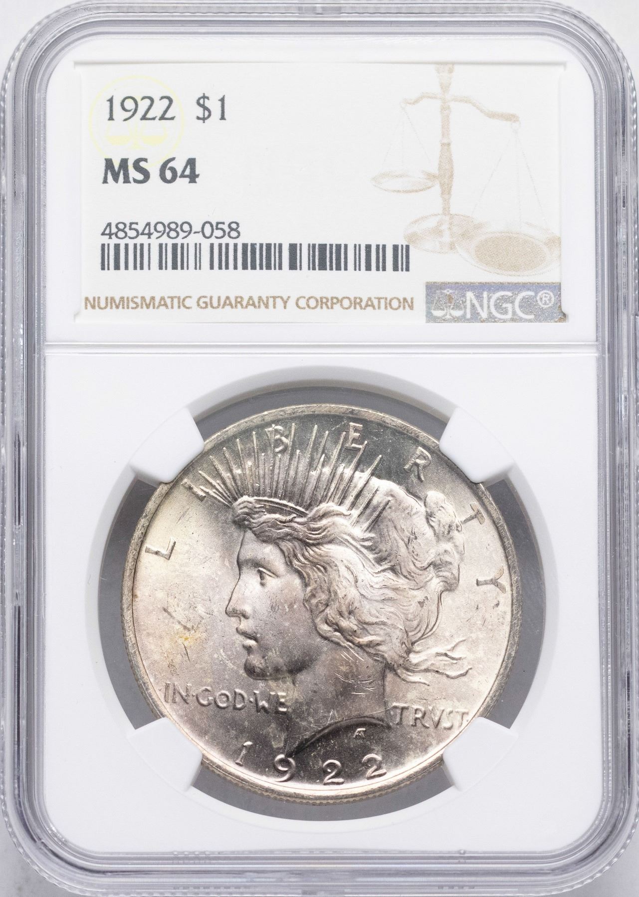 One 1922 $1 Peace Silver Dollar Coin NGC MS64.