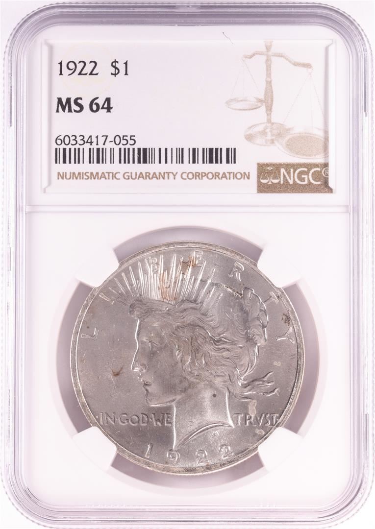 One 1922 $1 Peace Silver Dollar Coin NGC MS64. NGC Certified.