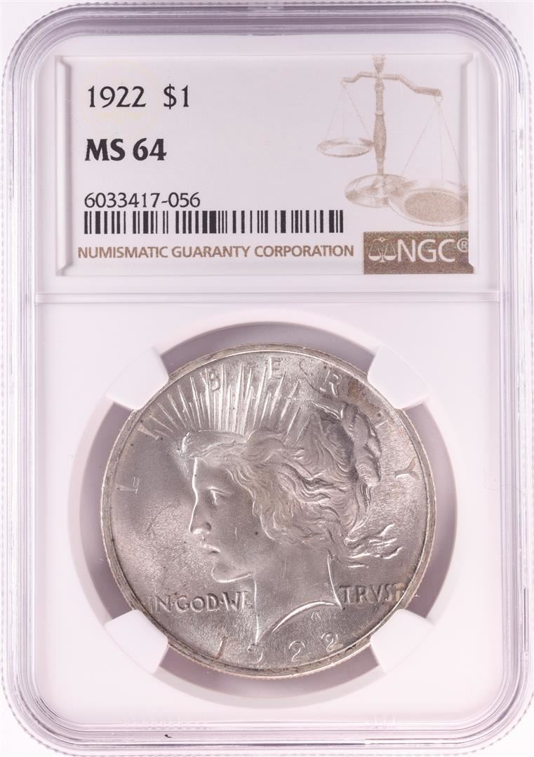 One 1922 $1 Peace Silver Dollar Coin NGC MS64. NGC Certified.