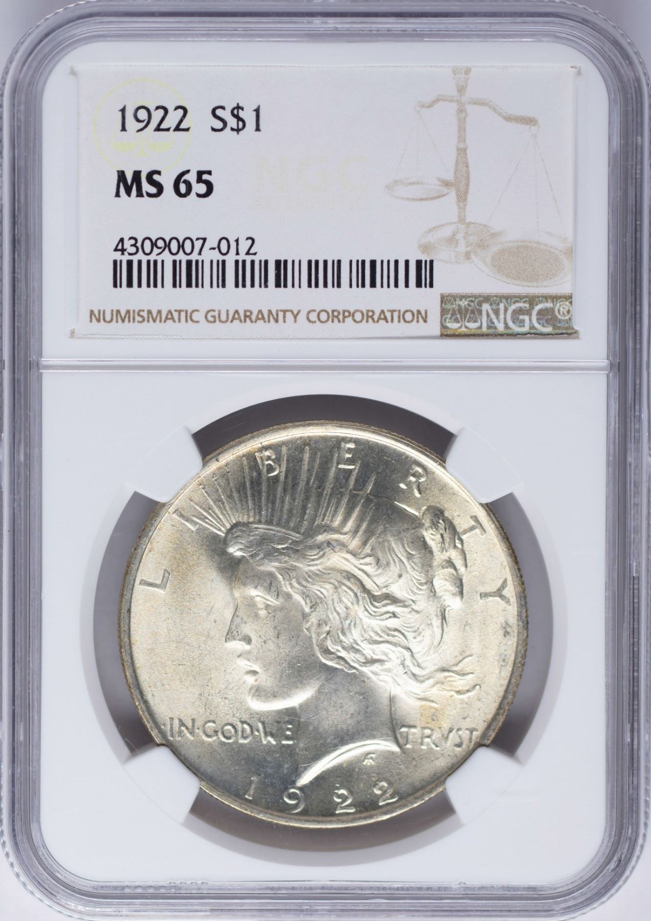 One 1922 $1 Peace Silver Dollar Coin NGC MS65 Nice Toning.
