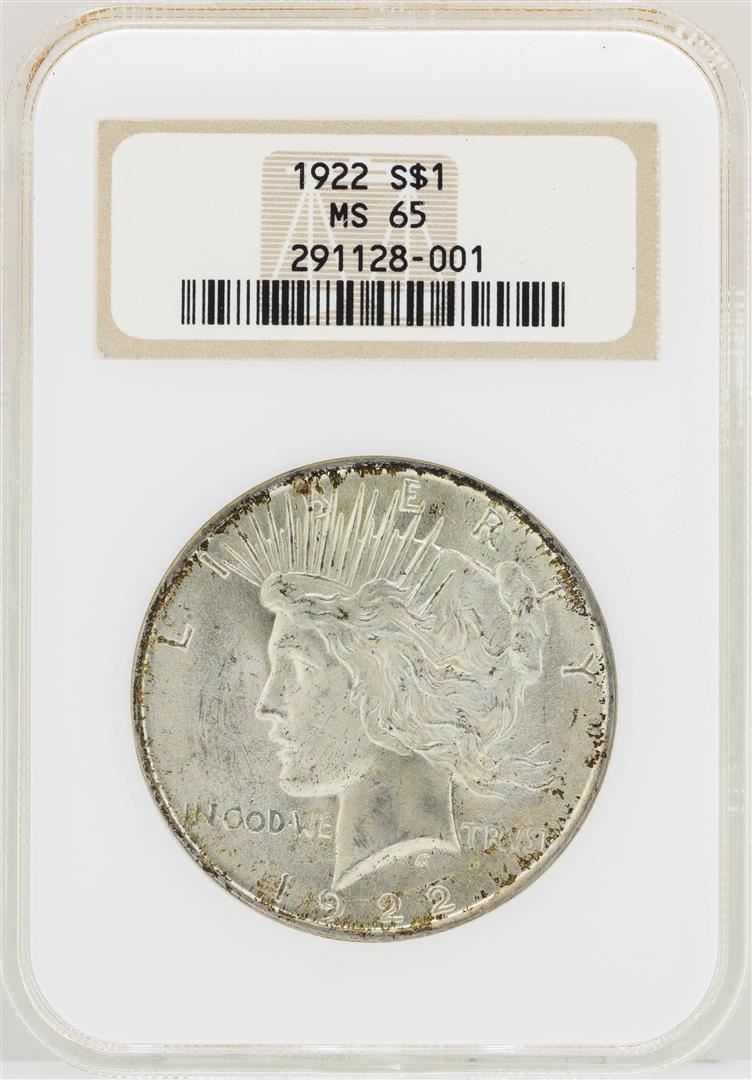 One 1922 $1 Peace Silver Dollar Coin NGC MS65. NGC Certified.
