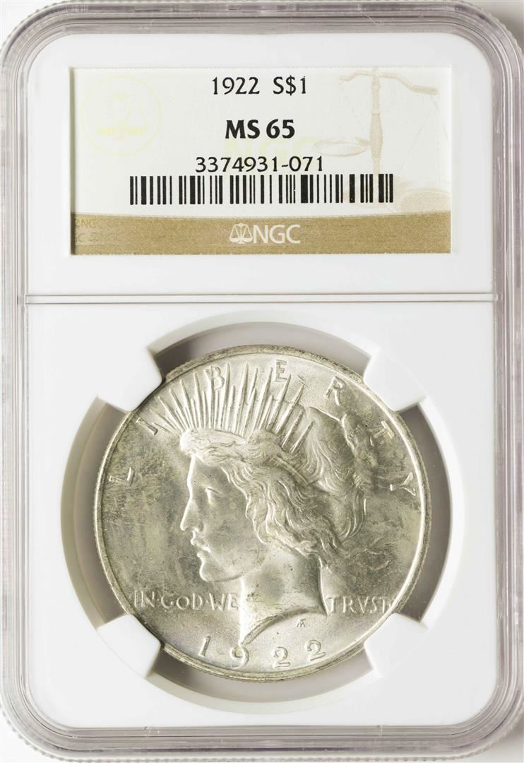 One 1922 $1 Peace Silver Dollar Coin NGC MS65. NGC Certified.