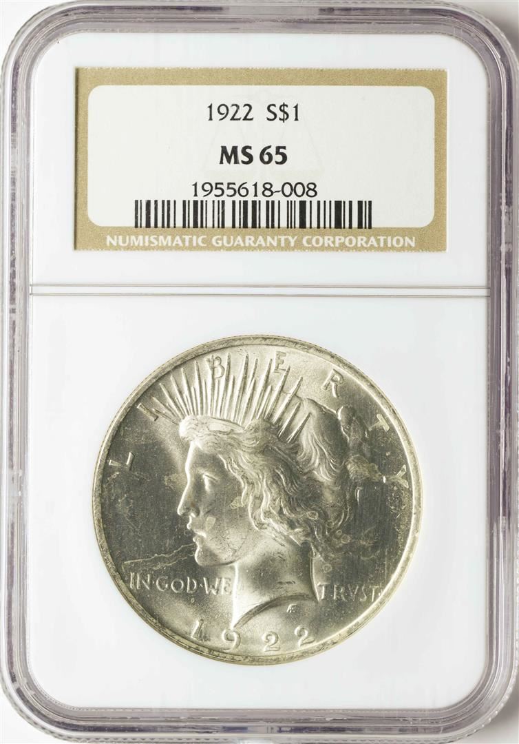 One 1922 $1 Peace Silver Dollar Coin NGC MS65. NGC Certified.