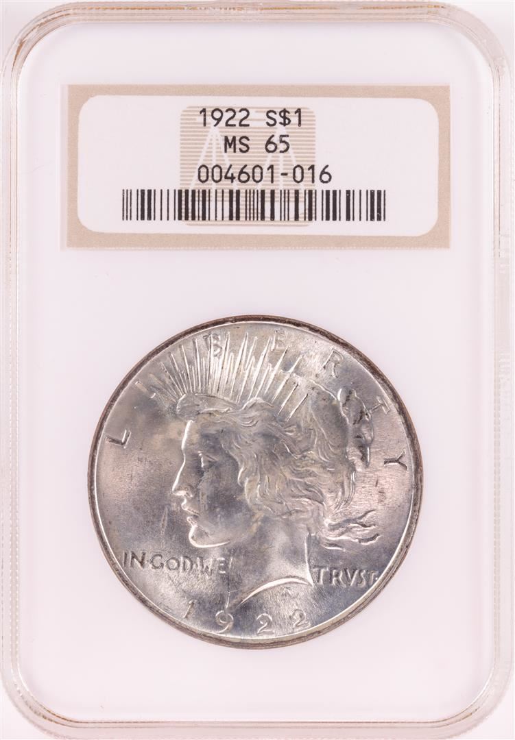 One 1922 $1 Peace Silver Dollar Coin NGC MS65. NGC Certified.